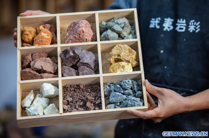 WUYISHAN, 25. Dezember 2025 (Xinhua) -- Ein Künstler präsentiert Gesteinspigmente in der Stadt Wuyishan in der Provinz Fujian im Südosten Chinas, 22. Dezember 2025. Wuyishan verfügt über eine große Vielfalt an farbenfrohen Gesteinen und Erden, die als natürliche Palette für die Malerei dienen und die unverwechselbare Wuyi-Gesteinspigmentkunst hervorgebracht haben. Durch die Integration moderner künstlerischer Elemente und Techniken in die Tradition wird die Wuyi-Gesteinspigmentmalerei allmählich zu einem einzigartigen kulturellen Merkmal von Wuyishan. (Foto von Chen Ying/Xinhua)