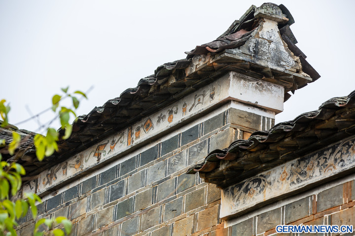 WUYISHAN, 25. Dezember 2025 (Xinhua) -- Das Foto zeigt dekorative Muster, die mit Gesteinspigmenten auf ein altes Wohngebäude in der Stadt Wuyishan in der Provinz Fujian im Südosten Chinas gemalt wurden, 21. Dezember 2025. Wuyishan verfügt über eine große Vielfalt an farbenfrohen Gesteinen und Erden, die als natürliche Palette für die Malerei dienen und die unverwechselbare Wuyi-Gesteinspigmentkunst hervorgebracht haben. Durch die Integration moderner künstlerischer Elemente und Techniken in die Tradition wird die Wuyi-Gesteinspigmentmalerei allmählich zu einem einzigartigen kulturellen Merkmal von Wuyishan. (Foto von Chen Ying/Xinhua)