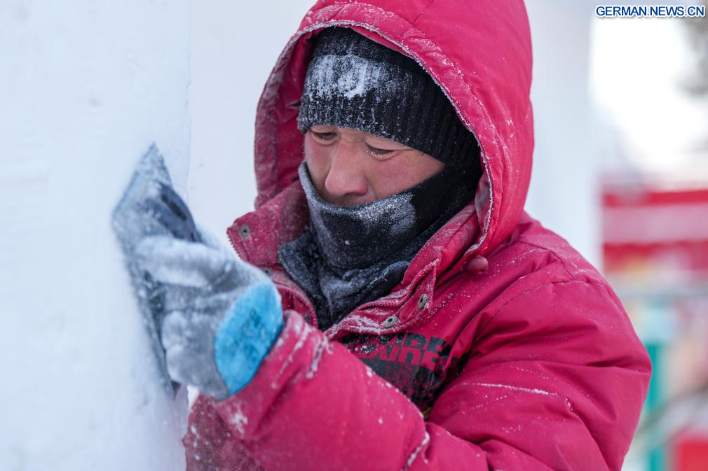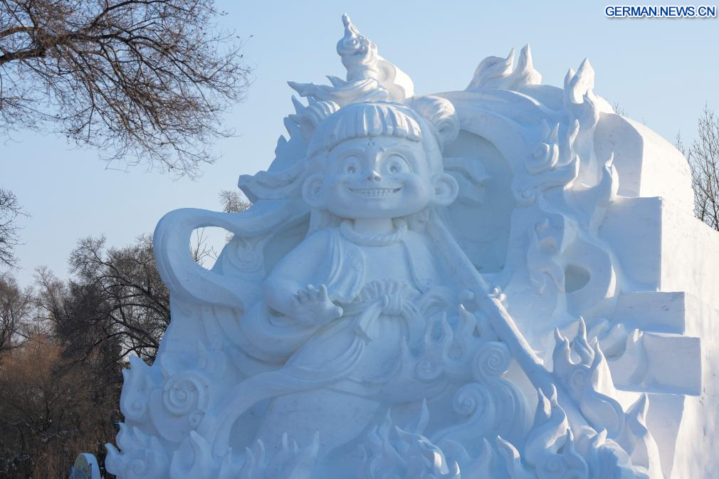 HARBIN, 27. Dezember 2025 (Xinhuanet) -- Das am 26. Dezember 2025 aufgenommene Foto zeigt eine Schneeskulptur, die auf dem Gelände der 38. Sun Island International Snow Sculpture Art Expo in Harbin in der nordostchinesischen Provinz Heilongjiang ausgestellt ist. Die 38. Sun Island International Snow Sculpture Art Expo begann hier am Samstag ihren Probebetrieb mit einer Ausstellungsfläche von 1,5 Millionen Quadratmetern und 120.000 Kubikmetern Schnee. (Quelle: Xinhua/Wang Song)