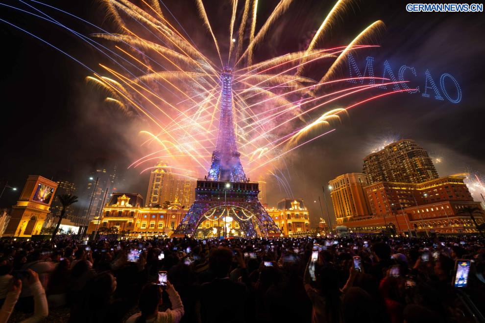 BEIJING, 1. Januar 2026 (Xinhuanet) -- Feuerwerke erhellen den Himmel über Cotai Strip zur Feier des neuen Jahres in Macao, Südchina, 1. Januar 2026. (Quelle: Xinhua/Cheong Kam Ka)