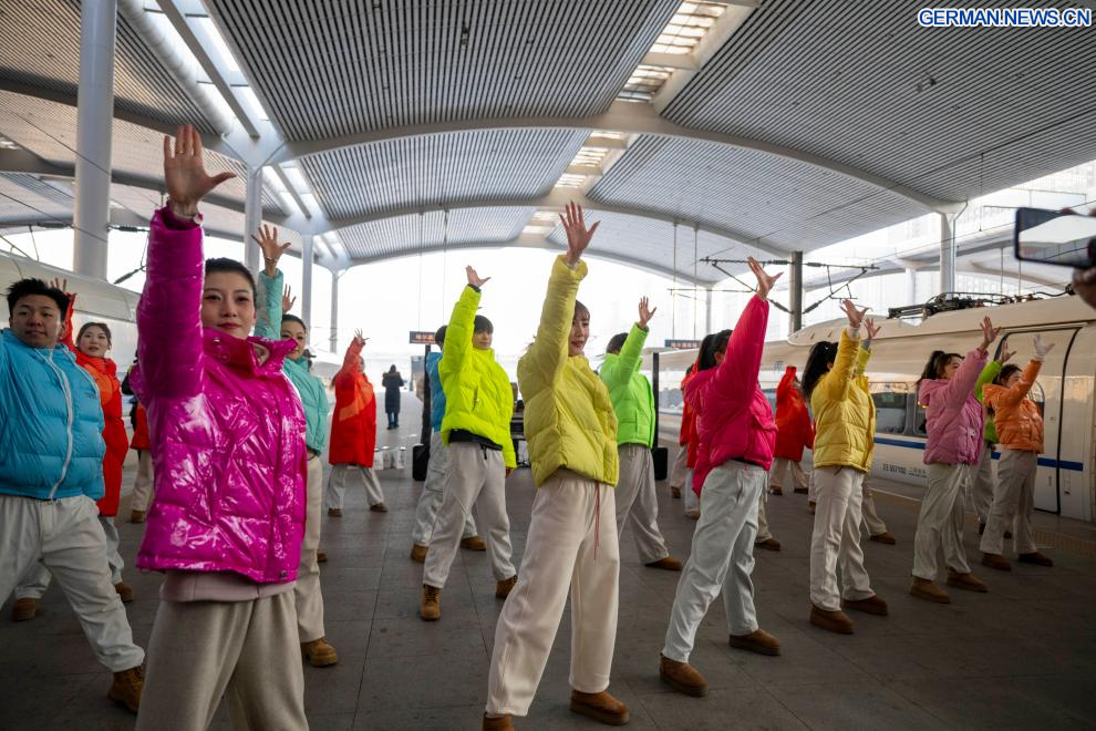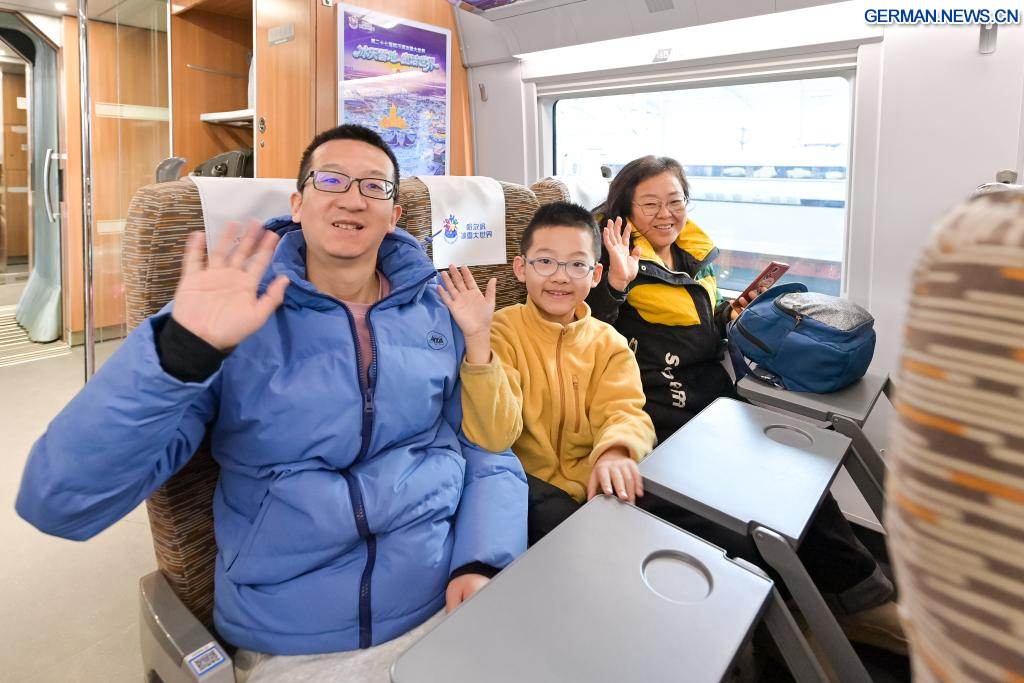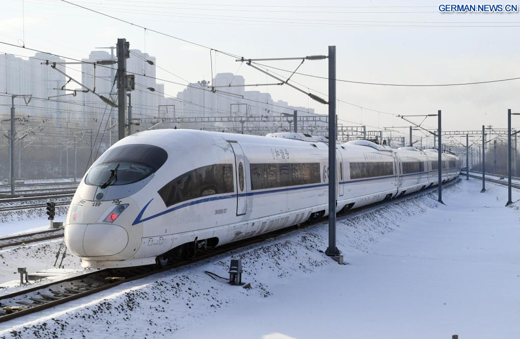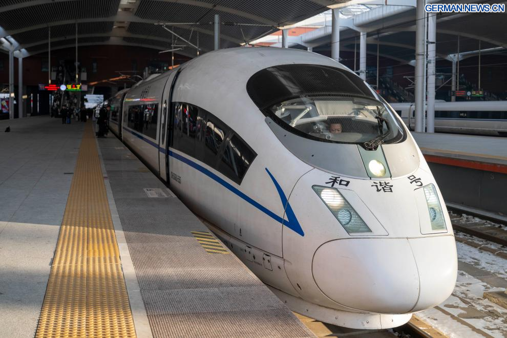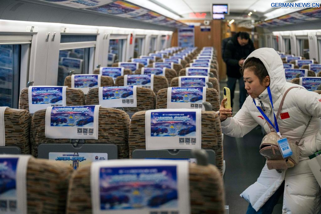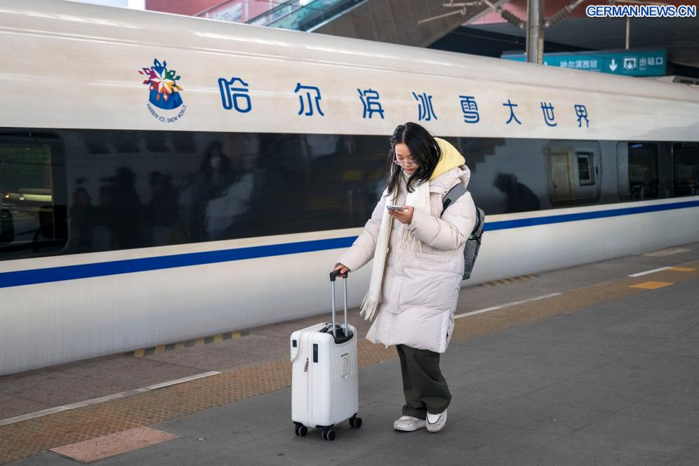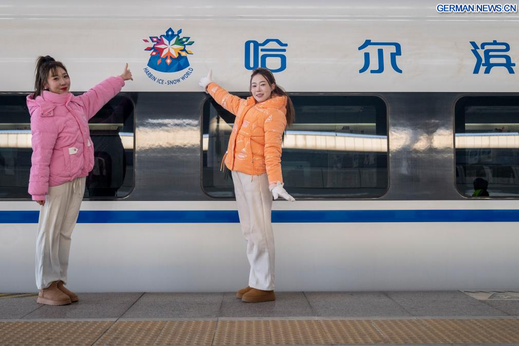 HARBIN, 4. Januar 2026 (Xinhuanet) -- Der Hochgeschwindigkeitszug Nr. G1276, der erste Themen-Hochgeschwindigkeitszug der Eis- und Schneewelt von Harbin, ist am Bahnhof Harbin West in der nordostchinesischen Provinz Heilongjiang zu sehen, 4. Januar 2026. Der erste Hochgeschwindigkeitszug mit dem Thema Eis- und Schneewelt von Harbin nahm am Sonntag am Bahnhof Harbin West seinen Betrieb auf und begab sich in Richtung Wuhan in der zentralchinesischen Provinz Hubei. Mit seiner einzigartigen Innen- und Außengestaltung, die an Eis- und Schneewelt von Harbin angelehnt ist, dient der Themen-Hochgeschwindigkeitszug als mobiles Wahrzeichen zur Förderung der Eis- und Schneewirtschaft. (Quelle: Xinhua/Zhang Tao)