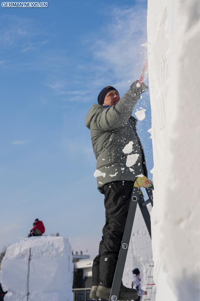 HARBIN, 6. Januar 2026 (Xinhuanet) -- Teilnehmer arbeiten an einer Schneeskulptur auf dem Gelände der Sun Island International Snow Sculpture Art Expo in Harbin in der nordostchinesischen Provinz Heilongjiang, 6. Januar 2026. Der 28. internationale Schneeskulpturenwettbewerb in Harbin begann hier am Dienstag und zog 25 Teams von Schneeskulpturenkünstlern aus 13 Ländern an. (Quelle: Xinhua/Wang Jianwei)