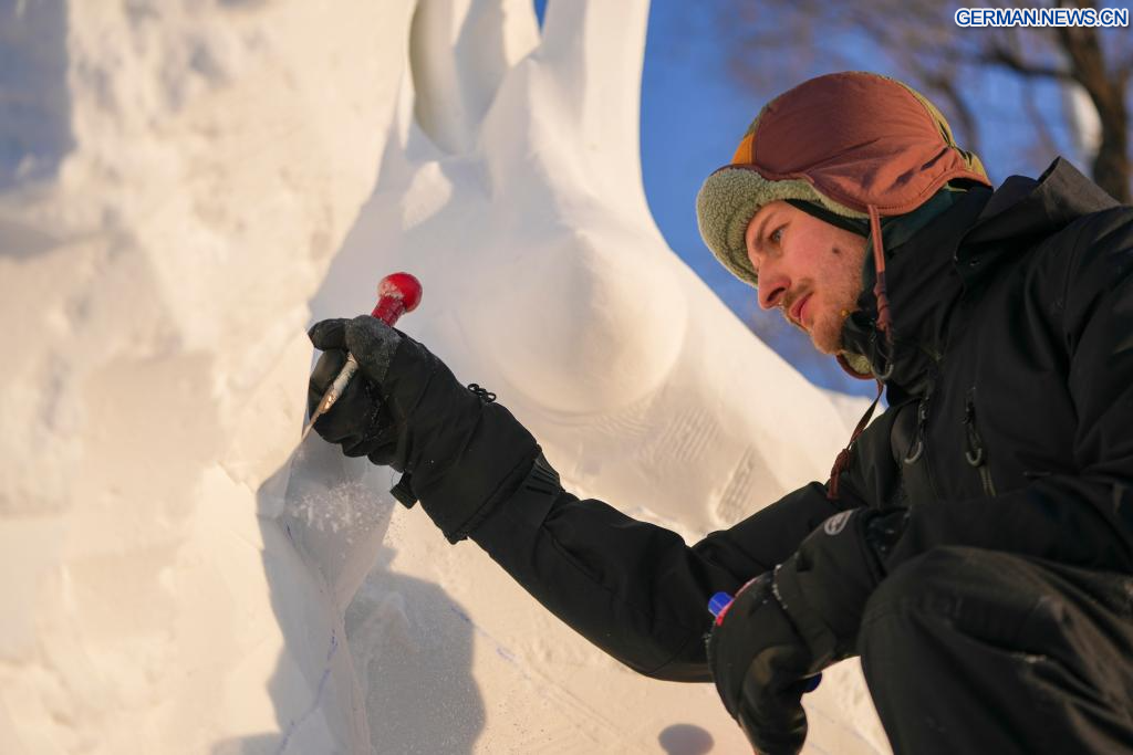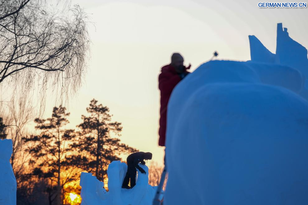 HARBIN, 7. Januar 2026 (Xinhuanet) -- Teilnehmer arbeiten an einer Schneeskulptur auf dem Gelände der Sun Island International Snow Sculpture Art Expo in Harbin in der nordostchinesischen Provinz Heilongjiang, 7. Januar 2026. Der 28. Harbin international snow sculpture competition begann hier am Dienstag und zog 25 Teams von Schneeskulpturenkünstlern aus 13 Ländern an. Verschiedene Schneeskulpturen nahmen am Mittwoch Gestalt an. (Quelle: Xinhua/Wang Jianwei)