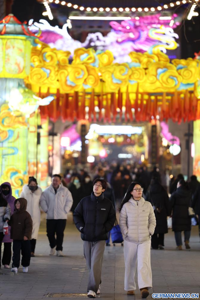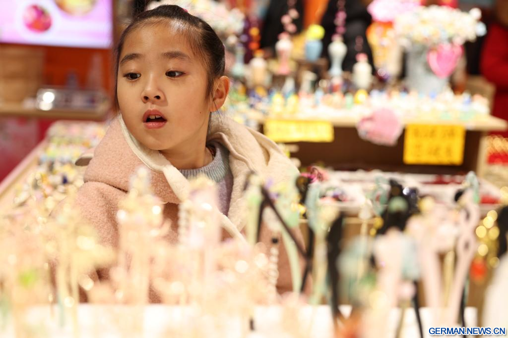 LANZHOU, 7. Januar 2026 (Xinhuanet) -- Ein Mädchen wählt Accessoires in einem Geschäft im Bezirk Qilihe in Lanzhou in der nordwestchinesischen Provinz Gansu aus, 6. Januar 2026. Zu Beginn des neuen Jahres schafft Lanzhou aktiv eine festliche Atmosphäre und treibt die Aufwertung etablierter Geschäftsviertel und charakteristischer Straßen im Stadtgebiet voran. Eine Reihe neuer Produkte und Dienstleistungen wurde eingeführt, um den Konsum anzukurbeln. (Quelle: Xinhua/Chen Bin)