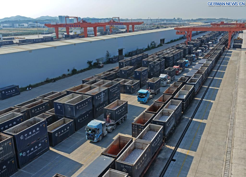 NANNING, 8. Januar 2026 (Xinhuanet) -- Das am 8. Januar 2026 aufgenommene Luftbild einer Drohne zeigt den Internationalen Eisenbahnhafen von Nanning in Nanning im südchinesischen Autonomen Gebiet Guangxi der Zhuang. Der Zugdienst des Neuen Internationalen Land-See-Handelskorridors von China habe im Jahr 2025 eine Rekordfrachtmenge von 1,425 Millionen Zwanzig-Fuß-Standardcontainern (TEU) abgewickelt, was einem Anstieg von 47,6 Prozent entspreche und erstmals die Marke von einer Million TEU überschreite, teilte die China Railway Nanning Group am Dienstag mit. (Quelle: Xinhua/Zhou Hua)