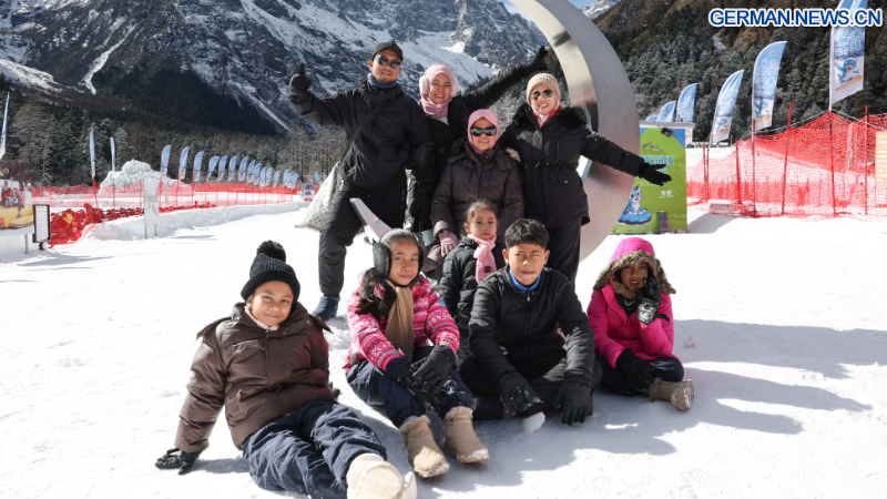 CHENGDU, 9. Januar 2026 (Xinhua) -- Touristen aus Malaysia haben Spaß in einem Skigebiet im Kreis Lixian in der Provinz Sichuan im Südwesten Chinas, 5. Januar 2026.