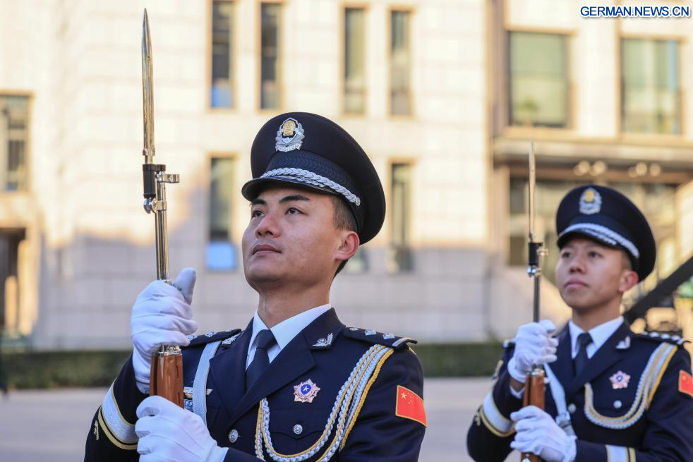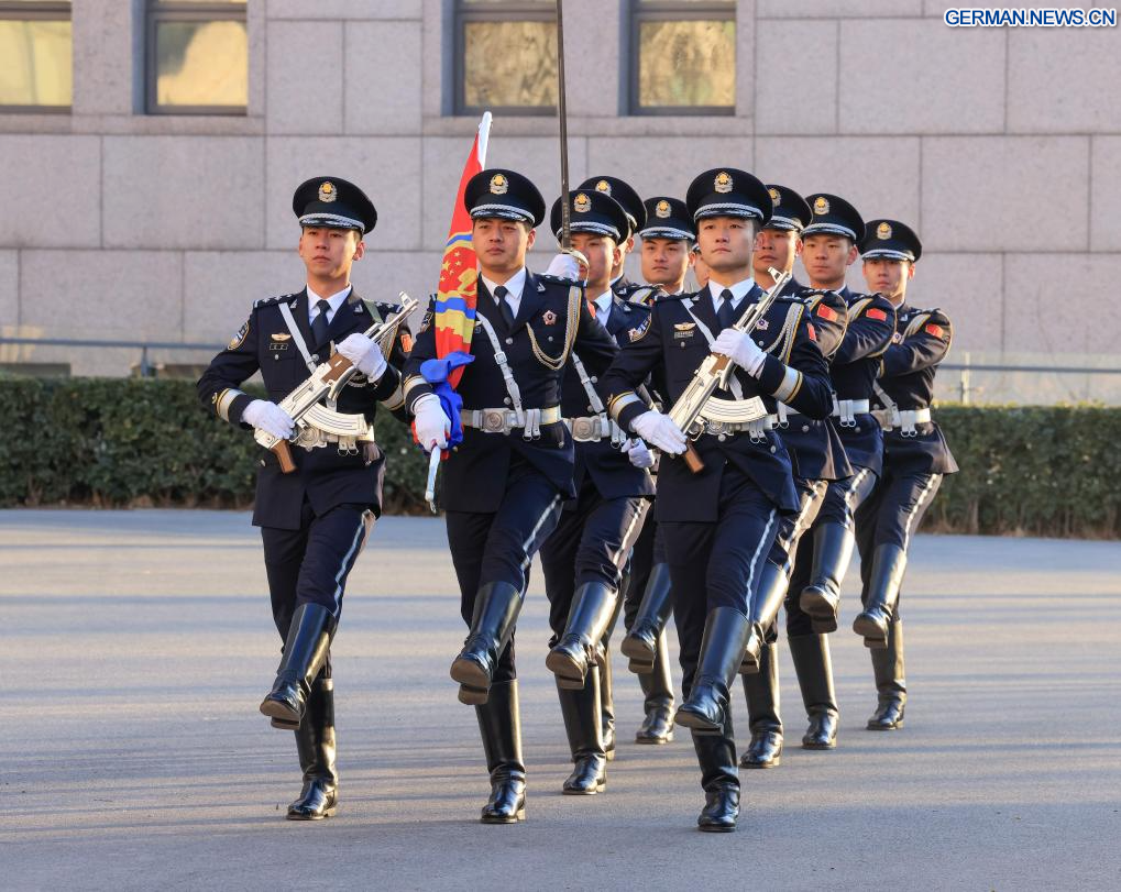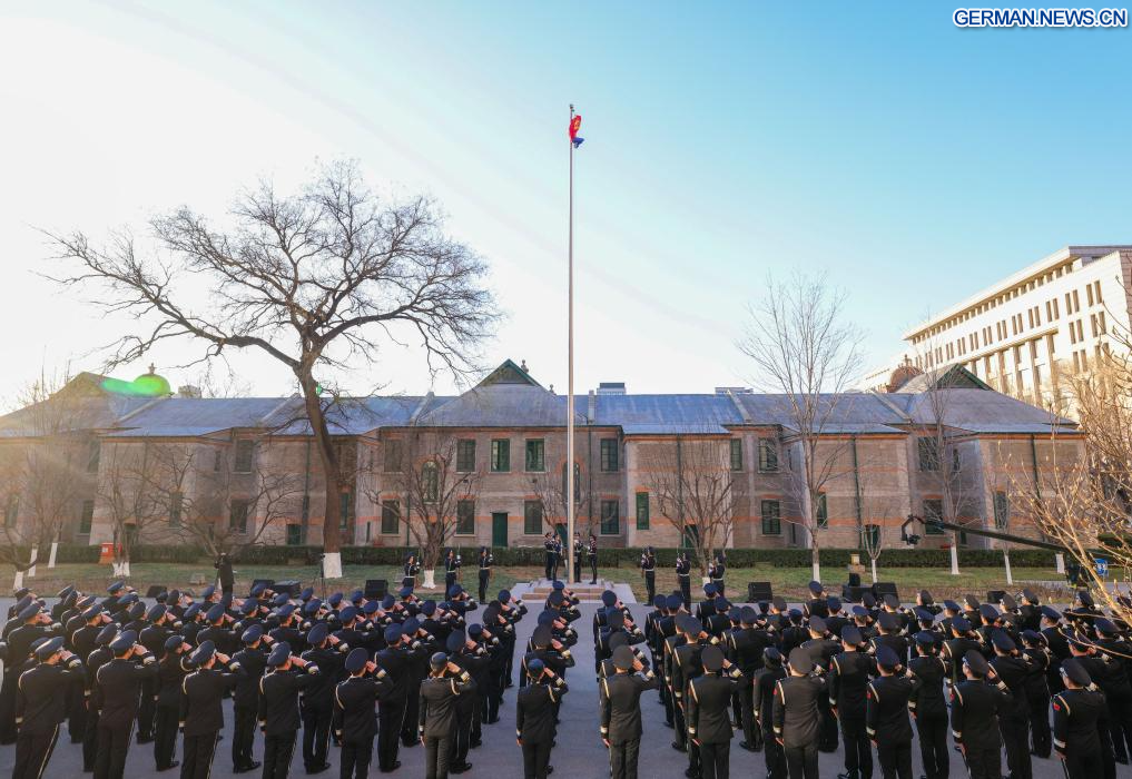 BEIJING, 10. Januar 2026 (Xinhuanet) -- Eine Fahnenzeremonie wird im Ministerium für öffentliche Sicherheit anlässlich des sechsten chinesischen Volkspolizeitags in Chinas Hauptstadt Beijing veranstaltet, 10. Januar 2026. (Quelle: Xinhua/Yin Gang)