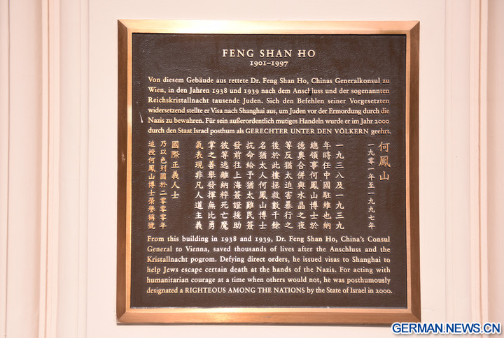 Das Foto zeigt eine Gedenktafel in Wien für Ho Feng-Shan, den ehemaligen chinesischen Generalkonsul in Österreich, 19. August 2025. (Xinhua/He Canling)