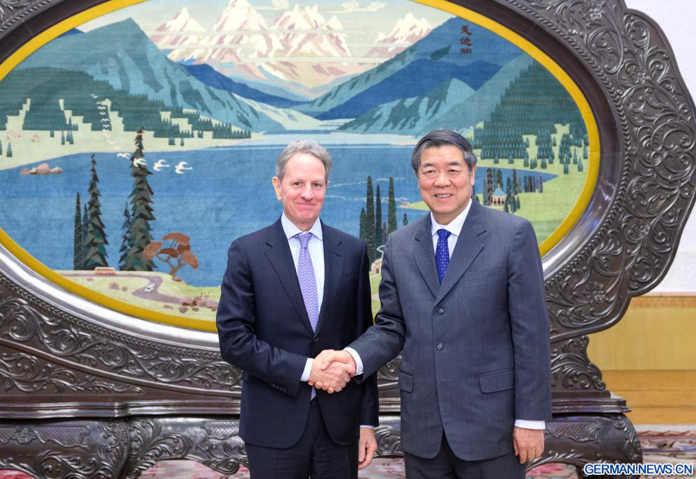 BEIJING, 12. Januar 2026 (Xinhuanet) -- Der chinesische Vize-Ministerpräsident He Lifeng, ebenfalls Mitglied des Politbüros des Zentralkomitees der Kommunistischen Partei Chinas, trifft sich in der Großen Halle des Volkes in Chinas Hauptstadt Beijing mit dem ehemaligen US-Finanzminister Timothy Geithner, der jetzt Vorsitzender von Warburg Pincus ist, 12. Januar 2026. (Quelle: Xinhua/Jin Liangkuai)