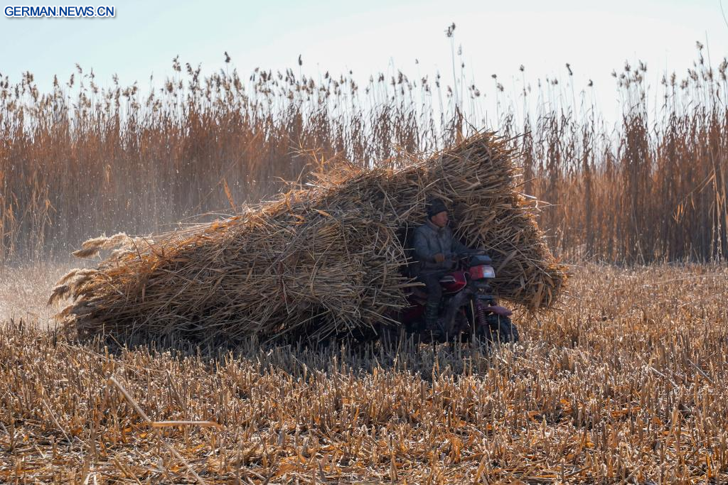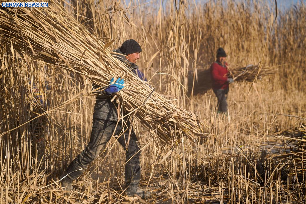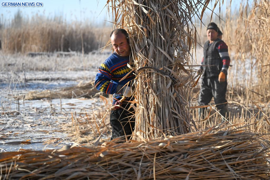 MOYU, 12. Januar 2026 (Xinhuanet) -- Ein lokaler Bauer presst das frisch geerntete Schilf zu Bündeln zusammen im Kreis Moyu in der Präfektur Hotan im Uigurischen Autonomen Gebiet Xinjiang im Nordwesten Chinas, 10. Januar 2026. Die Verhinderung und Bekämpfung der Wüstenbildung, eine der vorrangigsten Aufgaben in Xinjiang seit vielen Jahren, bietet den lokalen Bauern in der Nebensaison zusätzliche Beschäftigungsmöglichkeiten.