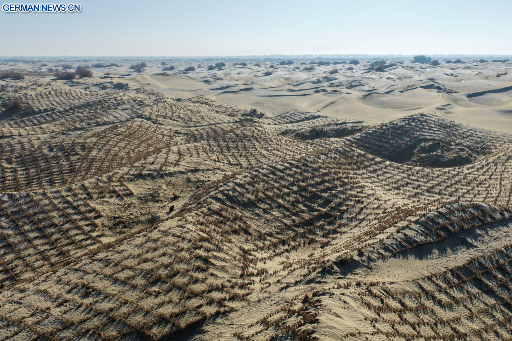 Trotz Temperaturen unter dem Gefrierpunkt sind die Bauern vor Ort derzeit damit beschäftigt, Schilf vorzubereiten und Sandgitter zu verlegen. Damit stärken sie nicht nur die ökologische Sicherheitslinie für die Nachbarschaft, sondern sichern auch ein zusätzliches Einkommen für ihre eigenen Familien. (Quelle: Xinhua/Ding Lei)