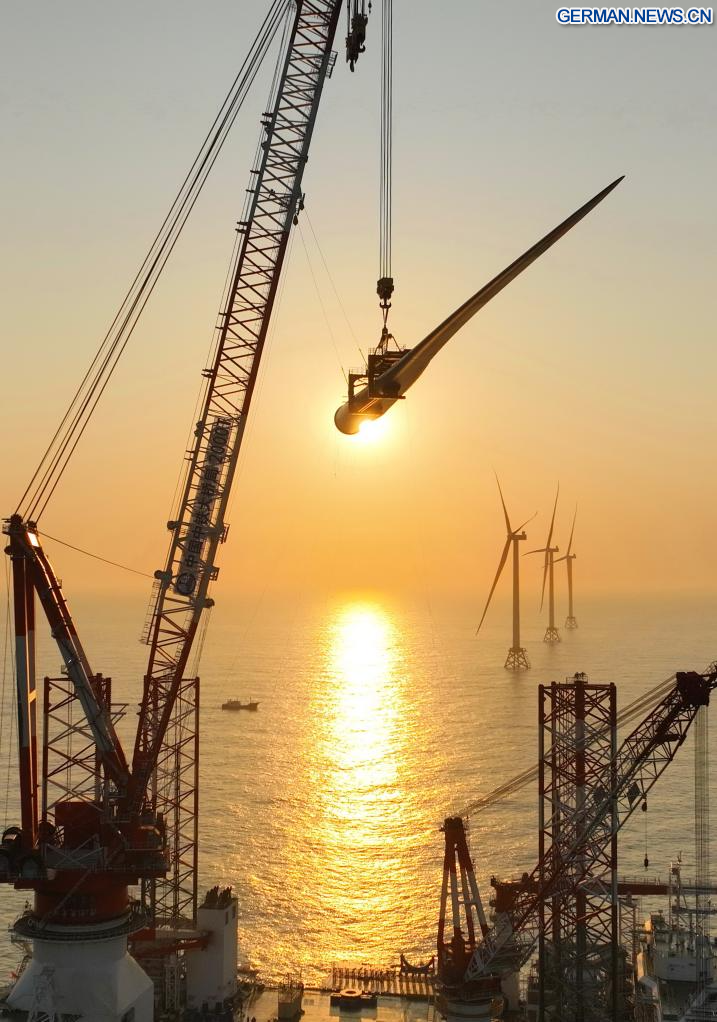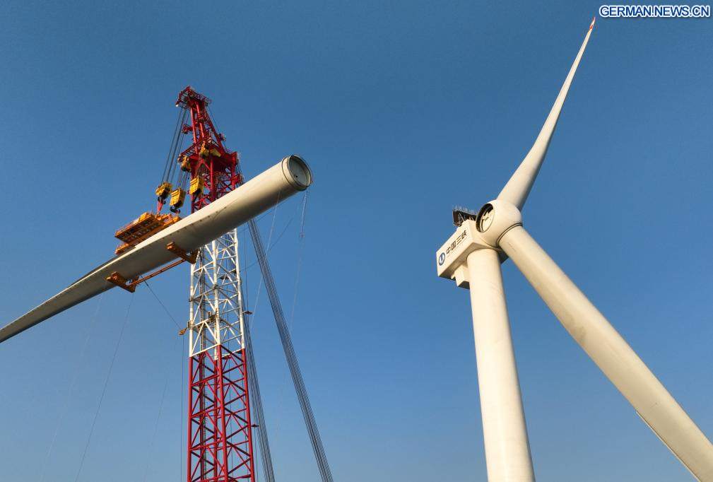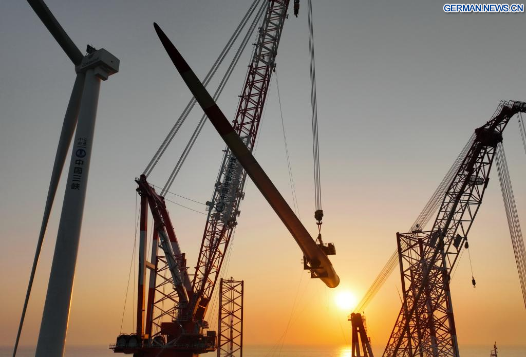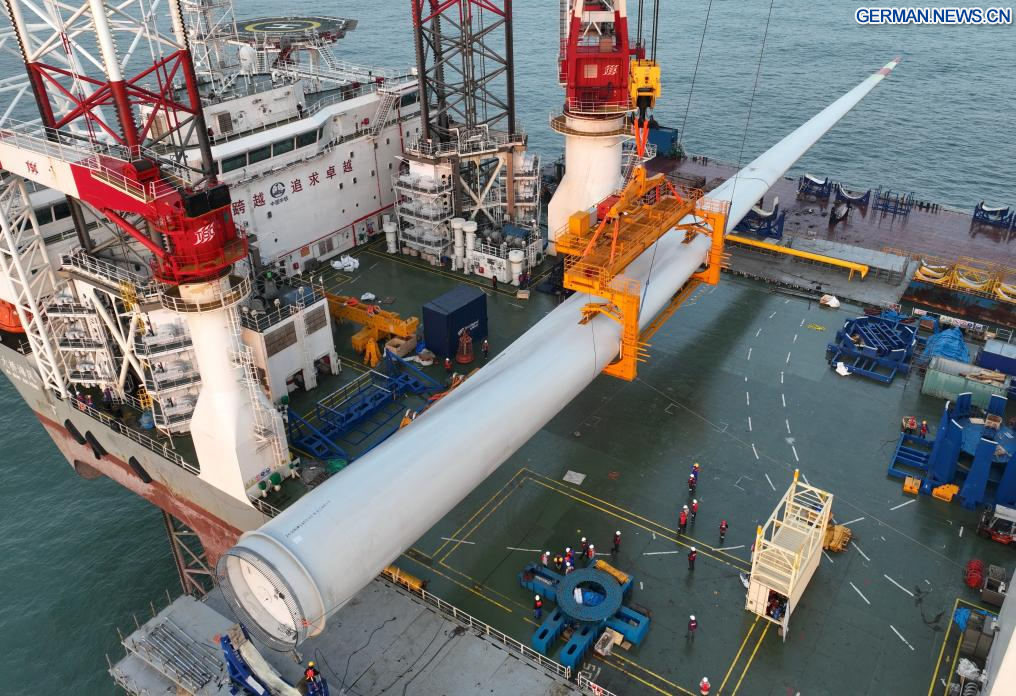 ZHANGZHOU, 13. Januar 2026 (Xinhuanet) -- Dieses am 13. Januar 2026 aufgenommene Drohnenfoto zeigt eine der Turbinenblätter, die auf der Baustelle einer 20-Megawatt-Offshore-Windkraftanlage in den Küstengewässern der südostchinesischen Provinz Fujian hochgezogen wird. Die Windkraftanlage wurde hier am Dienstag erfolgreich hochgezogen und installiert. (Quelle: Xinhua/Lin Shanchuan)