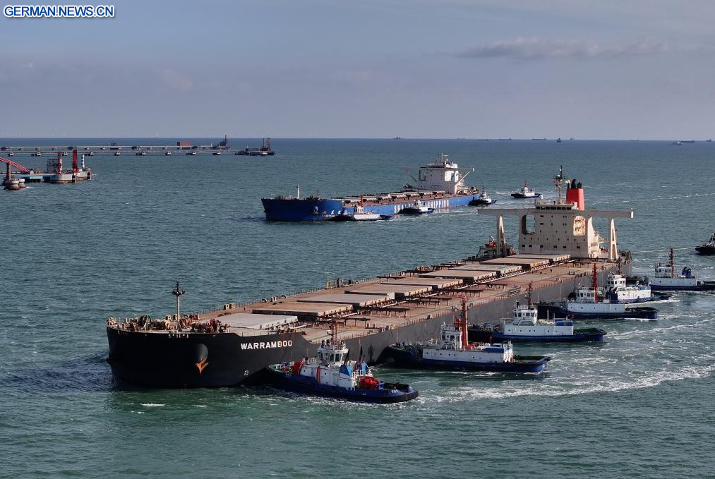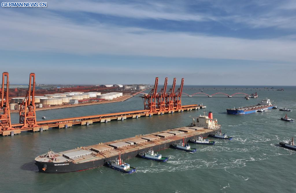 TANGSHAN, 13. Januar 2026 (Xinhuanet) -- Das am 13. Januar 2026 aufgenommene Drohnenfoto zeigt ein Massengutschiff, das mit Hilfe von Schleppern am Erzterminal des Hafengebiets Caofeidian im Hafen von Tangshan in Tangshan in der nordchinesischen Provinz Hebei anlegt. Der Hafen von Tangshan erzielte 2025 einen Gesamtfrachtumschlag von 883,99 Millionen Tonnen, was einem Anstieg von 2,53 Prozent im Jahresvergleich entspricht. (Quelle: Xinhua/Yang Shiyao)