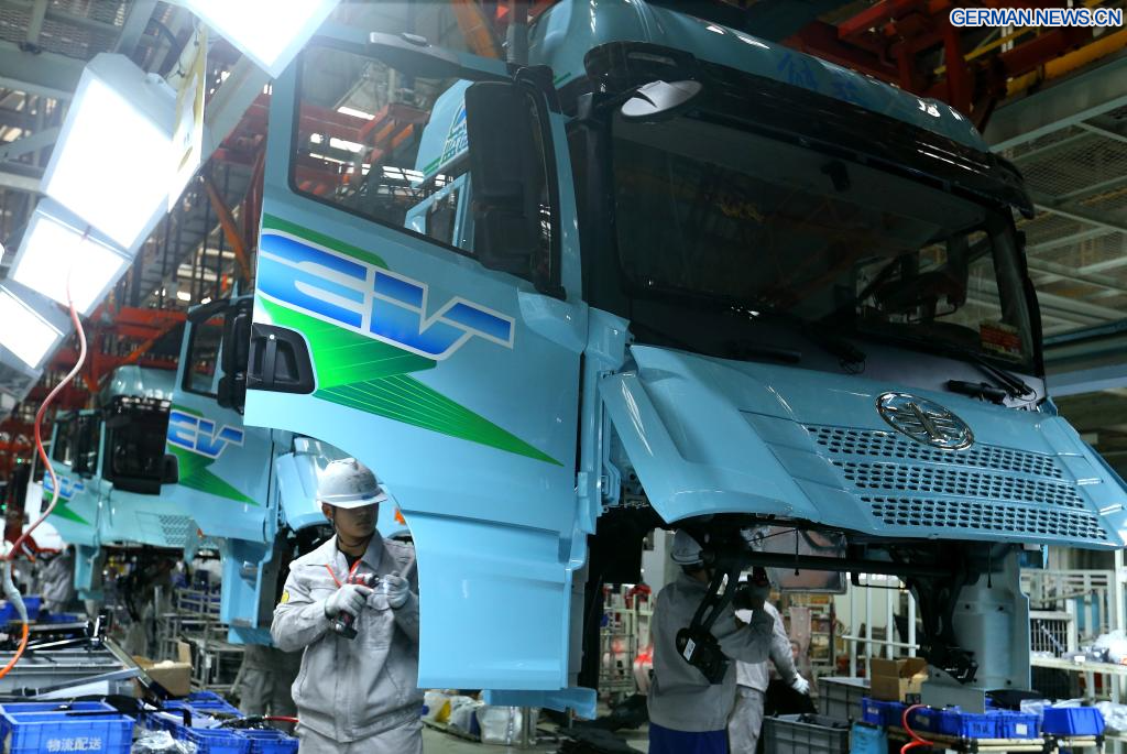 BEIJING, 14. Januar 2026 (Xinhuanet) -- Mitarbeiter montieren ein Fahrzeug mit neuer Energie in der Werkstatt von FAW Jiefang im Bezirk Jimo der Stadt Qingdao in der ostchinesischen Provinz Shandong, 23. Dezember 2025. (Foto von Liang Xiaopeng/Xinhua)
