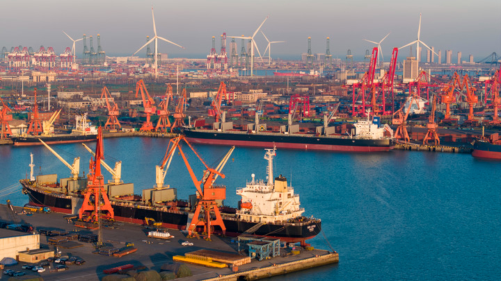 BEIJING, 14. Januar 2026 (Xinhuanet) -- Das am am 17. Dezember 2025 aufgenommene Luftbild einer Drohne zeigt ein Frachtschiff, das Fahrzeuge für den Export lädt, im Hafen von Lianyungang in Lianyungang in der ostchinesischen Provinz Jiangsu. (Foto von Wang Jianmin/Xinhua)