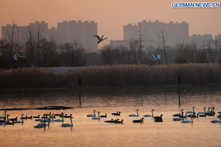 Zugvögel schwimmen auf dem Wasser im Minghu-Park in Chuzhou in der Provinz Anhui in Ostchina, 16. Dezember 2025. (Xinhua/Zhang Duan)