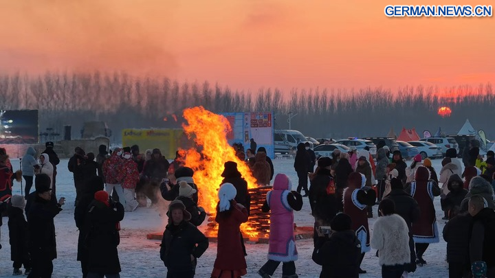 HARBIN, 17. Januar 2026 (Xinhuanet) -- Touristen singen und tanzan während des 4. Nordost-Camping-Karnevals im Dorf Hala im Ethnischen Bezirk Meilisi der Daur von Qiqihar in der nordostchinesischen Provinz Heilongjiang, 13. Januar 2026. (Foto von Wu Han/Xinhua)