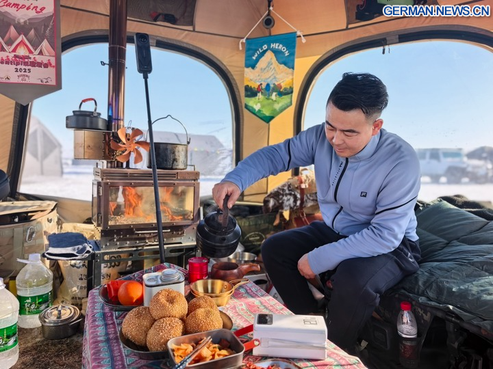 HARBIN, 17. Januar 2026 (Xinhuanet) -- Ein Camper genießt Tee und Essen in einem Zelt während des 4. Nordost-Camping-Karnevals im Dorf Hala im Ethnischen Bezirk Meilisi der Daur von Qiqihar in der nordostchinesischen Provinz Heilongjiang, 13. Januar 2026. (Quelle: Xinhua/Zhang Yue)