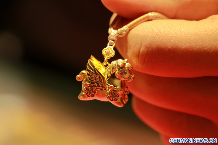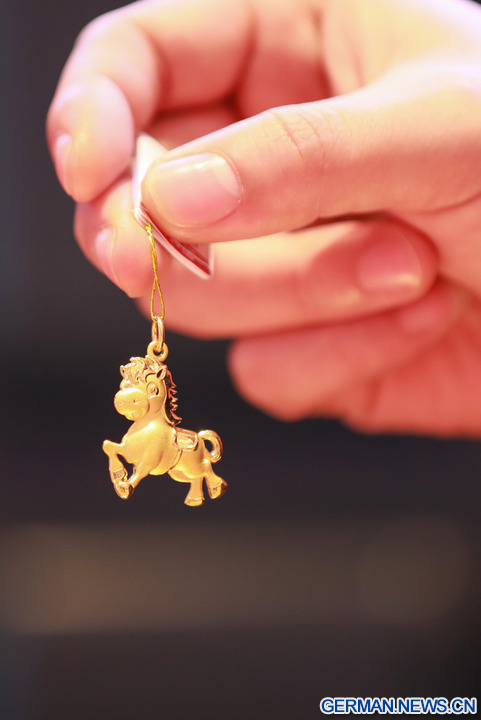 BEIJING, 21. Januar 2026 (Xinhua) -- Eine Verkäuferin zeigt Goldprodukte zum Thema „Jahr des Pferdes“ in einem Geschäft in der Stadt Binzhou in der Provinz Shandong in Ostchina, 16. Januar 2026. (Foto von Chu Baorui/Xinhua)