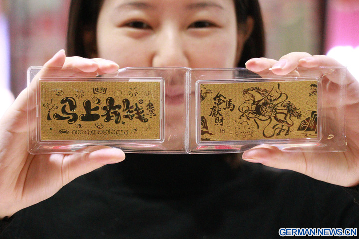 BEIJING, 21. Januar 2026 (Xinhua) -- Das Foto zeigt ein Goldprodukt zum Thema „Jahr des Pferdes“ in einem Geschäft in der Stadt Binzhou in der Provinz Shandong in Ostchina, 16. Januar 2026. (Foto von Chu Baorui/Xinhua)