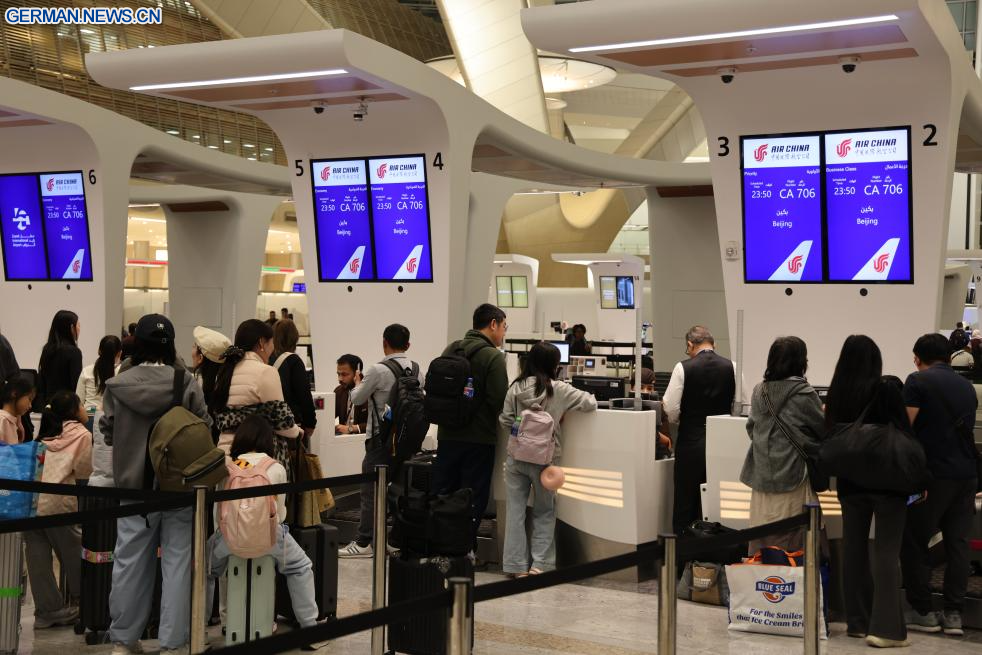 ABU DHABI, 25. Januar 2026 (Xinhuanet) -- Passagiere bereiten sich am Zayed International Airport in Abu Dhabi in den Vereinigten Arabischen Emiraten auf den Abflug nach Beijing vor, 24. Januar 2026. Eine Direktflugverbindung zwischen der chinesischen Hauptstadt Beijing und Abu Dhabi in den Vereinigten Arabischen Emiraten (VAE) wurde eingerichtet. Damit gibt es erstmals eine von einer chinesischen Fluggesellschaft betriebene Direktverbindung zwischen den beiden Hauptstädten. (Quelle: Xinhua)
