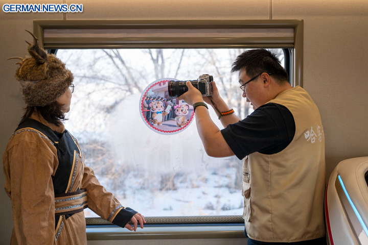 HARBIN, 26. Januar 2026 (Xinhua) -- Ein Fotograf fotografiert eine Passagierin im Zug Y783 in der Provinz Heilongjiang im Nordosten Chinas, 25. Januar 2026. Am Sonntag wurde in Harbin der Zug Y783 in Betrieb genommen, ein themenbezogener Tourismuszug mit einem Reisefotografie-Service, der nach Yabuli fährt. Es ist das erste Angebot dieser Art, das das Unternehmen in diesem Jahr anbietet. Der Zug wird von der China Railway Harbin Group Co., Ltd. betrieben und ermöglicht es den Passagieren, verschiedene Kostüme anzuziehen und Fotodienste in Anspruch zu nehmen. (Xinhua/Zhang Tao)