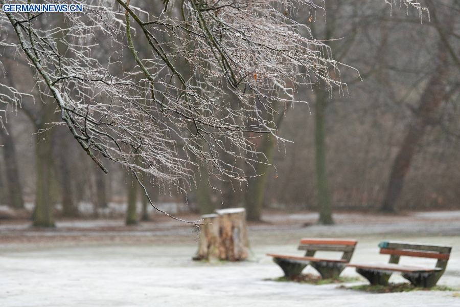 BERLIN, 27. Januar 2026 (Xinhua) -- Das Foto zeigt vereiste Äste in einem Park im Berliner Stadtbezirk Pankow, 26. Januar 2026. In Berlin kam es am Montag zu Glatteis, was zu Störungen im Straßenbahnverkehr und anderen öffentlichen Verkehrsmitteln führte. (Xinhua/Zhang Haofu)