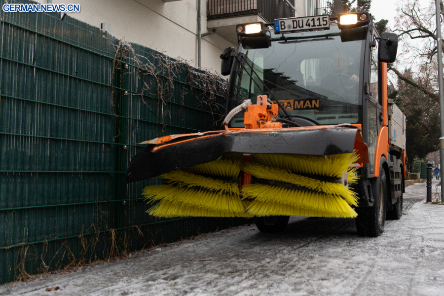 BERLIN, 27. Januar 2026 (Xinhua) -- Ein Winterdienstfahrzeug streut Splitt auf einen Gehweg im Berliner Stadtbezirk Pankow, 26. Januar 2026. In Berlin kam es am Montag zu Glatteis, was zu Störungen im Straßenbahnverkehr und anderen öffentlichen Verkehrsmitteln führte. (Xinhua/Zhang Haofu)
