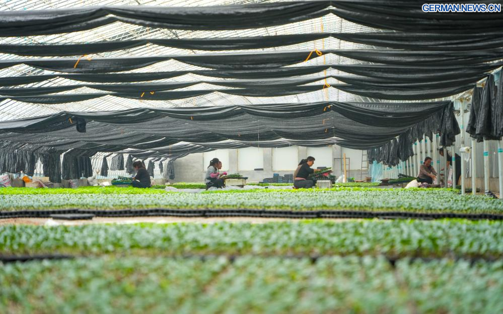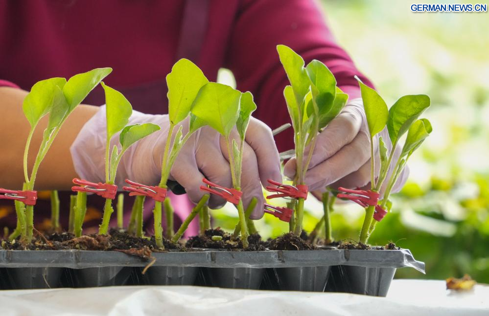 JINAN, 28. Januar 2026 (Xinhuanet) -- Bäuerinnen pfropfen Gemüsesetzlinge in einem Gewächshaus in der Gemeinde Yandian im Kreis Shenxian in der ostchinesischen Provinz Shandong, 28. Januar 2026. Als wichtiger Gemüselieferant verfügt Shenxian über eine Anbaufläche von mehr als 1 Million Mu (etwa 66.666,7 Hektar) und erreicht eine Jahresproduktion von 5,2 Millionen Tonnen. (Quelle: Xinhua/Xu Suhui)