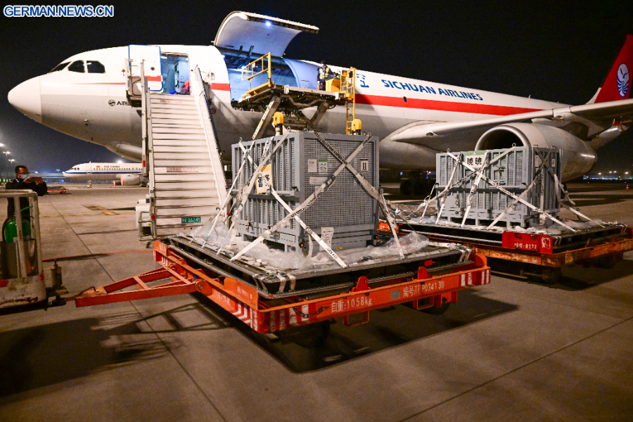 Das Paar, Xiao Xiao und Lei Lei, kam um ein Uhr morgens in Chengdu in der südwestchinesischen Provinz Sichuan an, zur Quarantäne in den Stützpunkt Ya'an des Chinesischen Zentrums für die Erhaltung und Erforschung des Riesenpandas (CCRCGP) gebracht wurde.