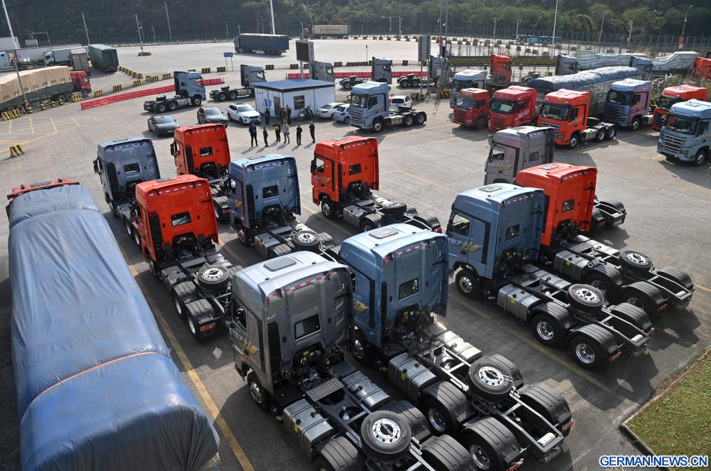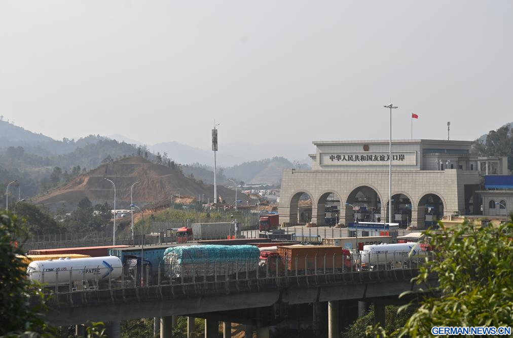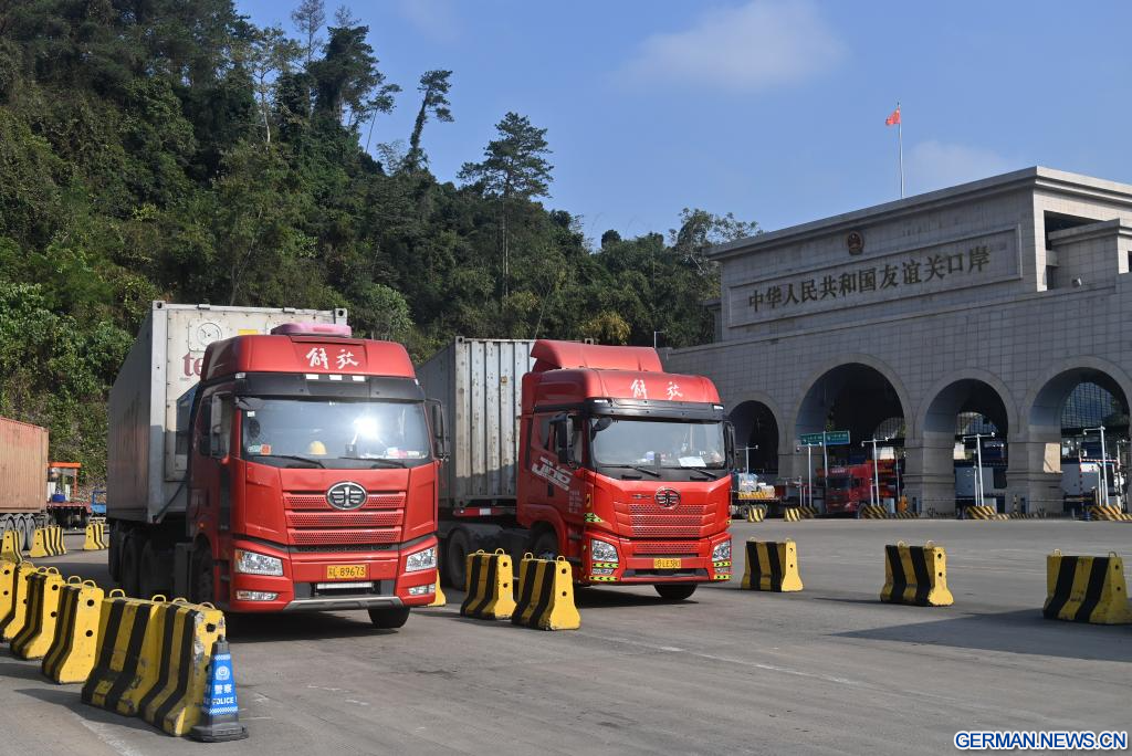 PINGXIANG, 28. Januar 2026 (Xinhuanet) -- Ein Lastwagen fährt in den Hafen Youyiguan, auch bekannt als „Freundschaftspass“, in der Stadt Pingxiang im südchinesischen Autonomen Gebiet Guangxi der Zhuang ein, 28. Januar 2026. (Quelle: Xinhua/Lu Boan)