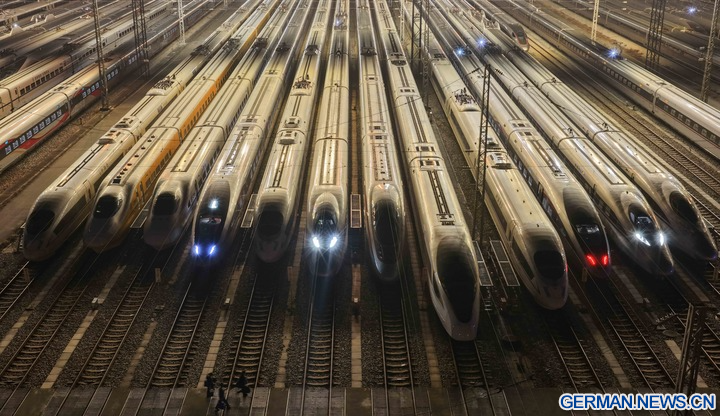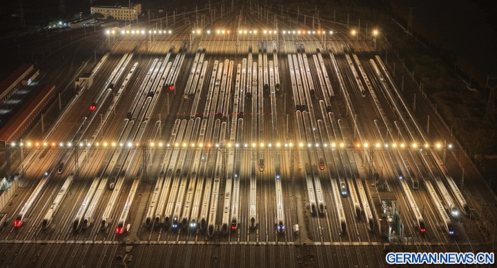 Hochgeschwindigkeitszüge in ganz China stehen für den bevorstehenden jährlichen Reiseansturm zum Frühlingsfest bereit, der auch als Chunyun bekannt ist und am 2. Februar 2026 beginnt. Jedes Jahr kehren Millionen von Menschen, die außerhalb ihrer Heimatstädte arbeiten, studieren oder leben, während dieser Hauptreisezeit zum Frühlingsfest, dem wichtigsten traditionellen Feiertag Chinas, nach Hause zurück und bilden damit die weltweit größte jährliche Migration von Menschen. (Xinhua/Deng Hua)