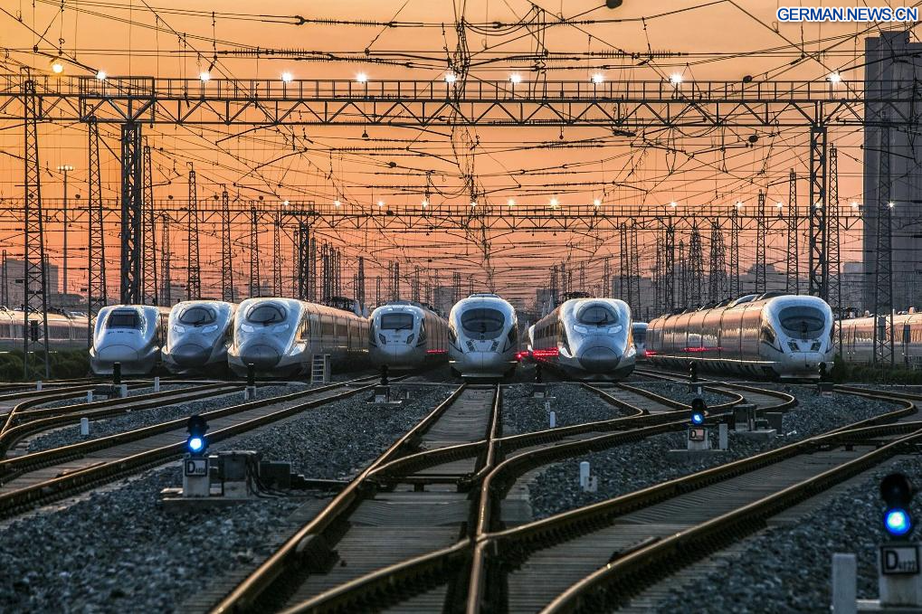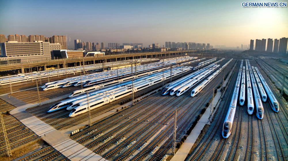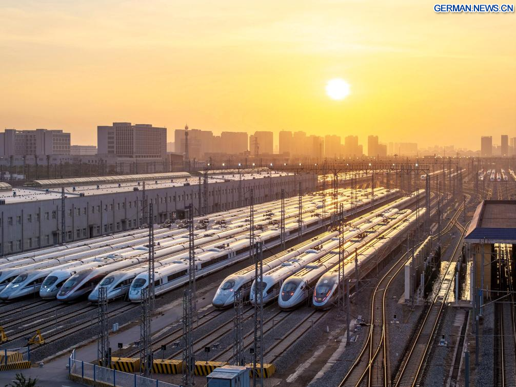 XI'AN, 1. Februar 2026 (Xinhuanet) -- Das am 1. Februar 2026 aufgenommene Luftbild einer Drohne zeigt Hochgeschwindigkeitszüge in Xi'an in der nordwestchinesischen Provinz Shaanxi, die für den Betrieb vorbereitet werden. (Foto von Zhang Wen/Xinhua)