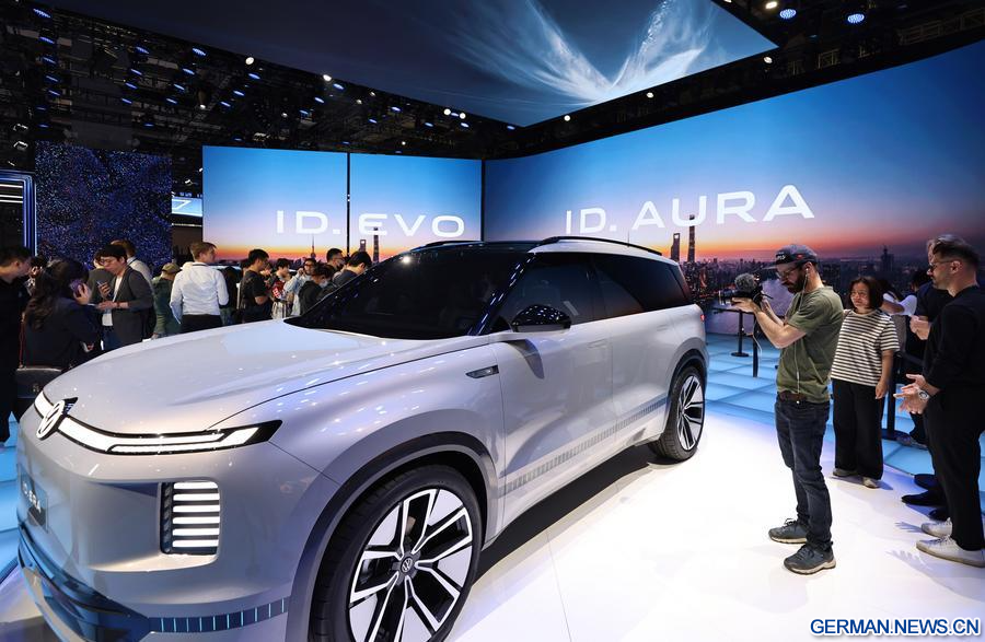Ein Journalist fotografiert einen ausgestellten Volkswagen ID.AURA auf der 21. Shanghai International Automobile Industry Exhibition in Ostchina, 23. April 2025. (Xinhua/Fang Zhe)