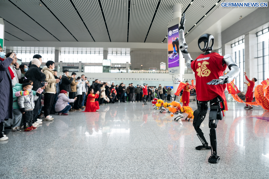 BEIJING, 2. Februar 2026 (Xinhua) -- Passagiere betrachten eine Roboteraufführung am Südbahnhof von Hefei in der Provinz Anhui in Ostchina, 2. Februar 2026.