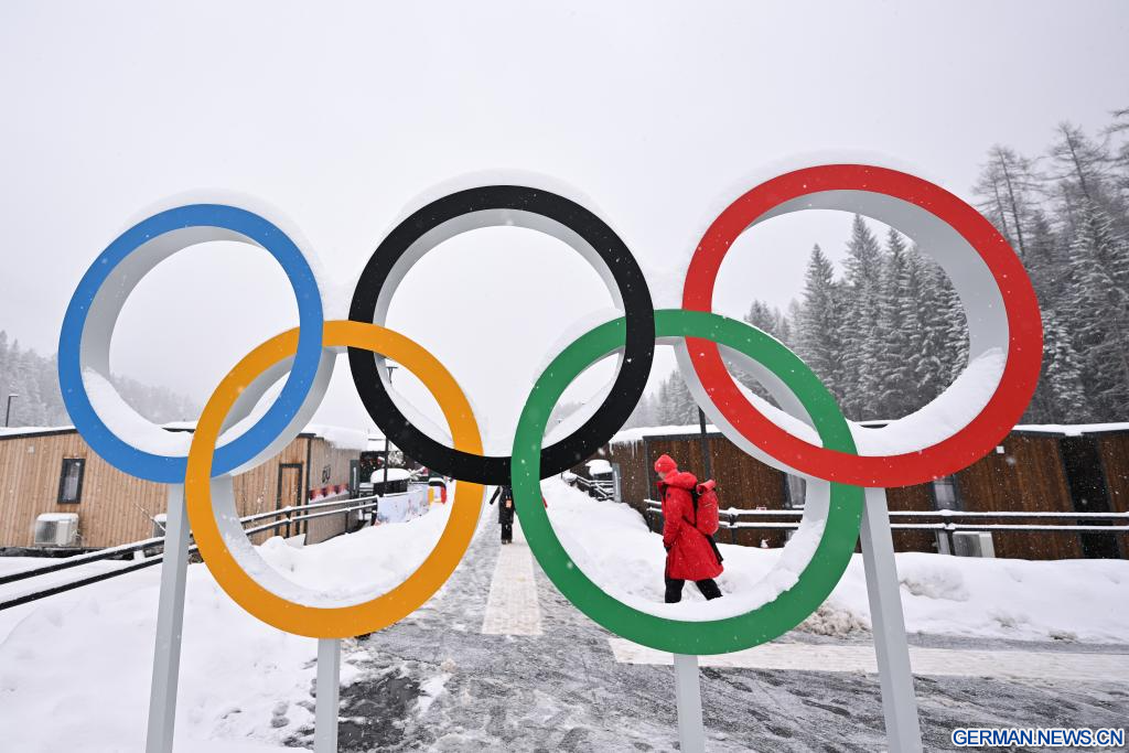 CORTINA D'AMPEZZO, 3. Februar 2026 (Xinhuanet) -- Das am 3. Februar 2026 aufgenommene Foto zeigt die olympischen Ringe im Olympischen und Paralympischen Dorf in Cortina D'Ampezzo, Italien, vor den Olympischen Winterspielen Milano Cortina 2026,. (Quelle: Xinhua/Lian Yi)