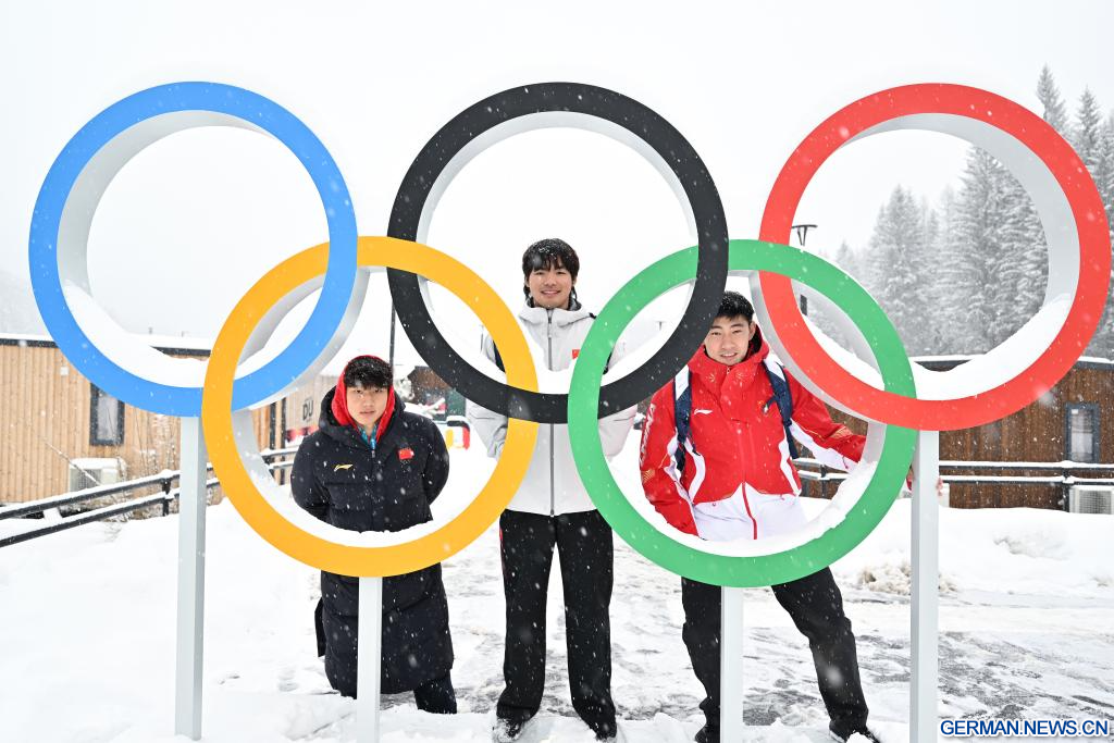 CORTINA D'AMPEZZO, 3. Februar 2026 (Xinhuanet) -- Die chinesischen Athleten Shi Yaolong, Ding Yunda und Sun Kaizhi (v. l. n. r.) posieren für Fotos im Olympischen und Paralympischen Dorf in Cortina D'Ampezzo, Italien, vor den Olympischen Winterspielen Milano Cortina 2026, 3. Februar 2026. (Quelle: Xinhua/Lian Yi)