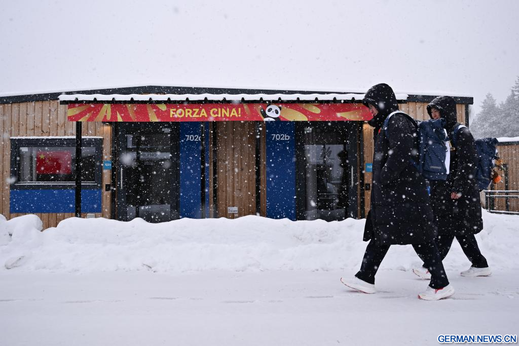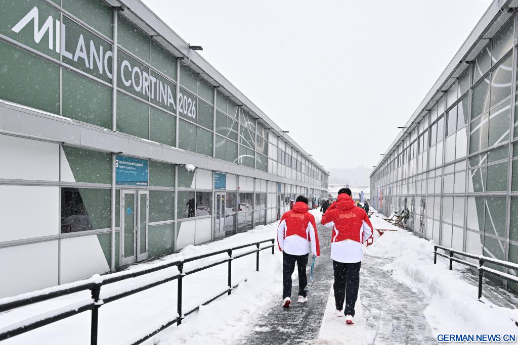 CORTINA D'AMPEZZO, 3. Februar 2026 (Xinhuanet) -- Mitglieder der chinesischen Delegation gehen im Olympischen und Paralympischen Dorf in Cortina D'Ampezzo, Italien, vor den Olympischen Winterspielen Milano Cortina 2026, 3. Februar 2026. (Quelle: Xinhua/Lian Yi)