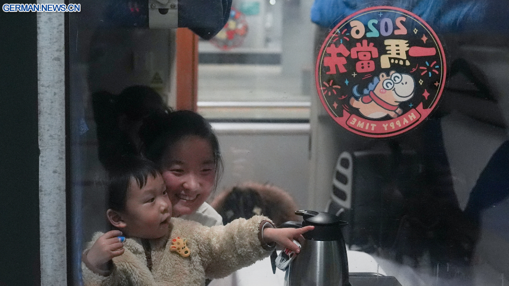 BEIJING, 3. Februar 2026 (Xinhua) -- Das Foto zeigt die siebenjährige Xixi (rechts) zusammen mit ihrer Mutter im Zug Nr. K4069 am frühen Morgen im Westbahnhof der chinesischen Hauptstadt Beijing vor der Rückreise zum Frühlingsfest in ihre Heimatstadt Zhoukou in der zentralchinesischen Provinz Henan, 2. Februar 2026. Am Montag, 15 Tage vor dem diesjährigen Frühlingsfest, auch bekannt als chinesisches Neujahrsfest, begann in China die größte jährliche Bevölkerungsbewegung.