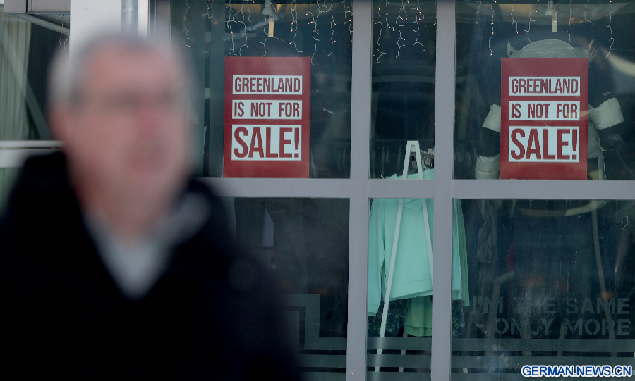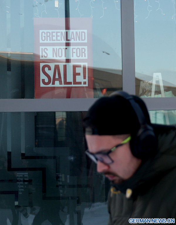 NUUK, 9. Februar 2026 (Xinhua) -- Das Foto zeigt Plakate mit der Aufschrift „GRÖNLAND IST NICHT ZU VERKAUFEN!” an einem Fenster in Nuuk in Grönland, einem autonomen Gebiet Dänemarks, 8. Februar 2026. (Xinhua/Li Ying)