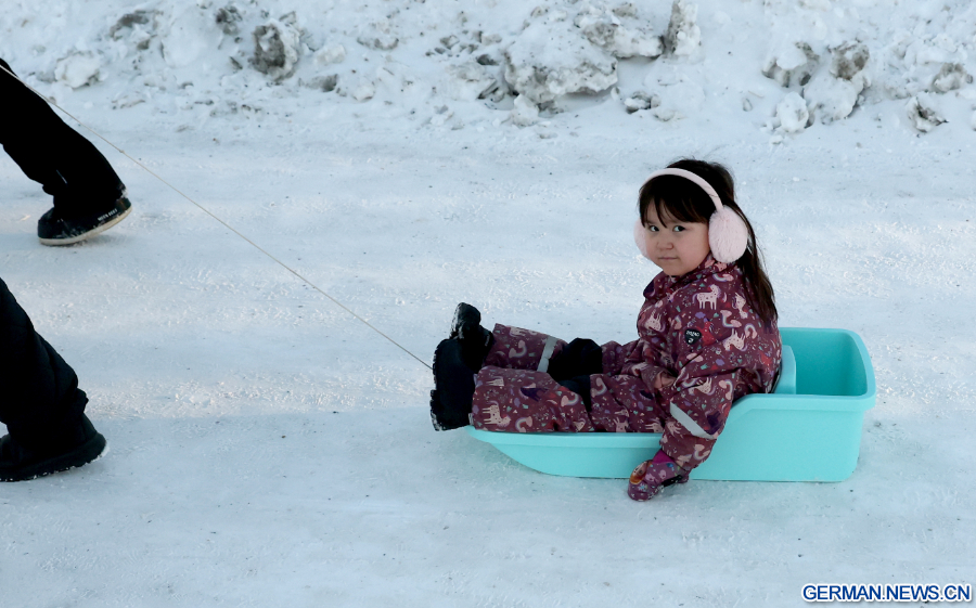 NUUK, 9. Februar 2026 (Xinhua) -- Das Foto zeigt ein kleines Mädchen auf einem Schlitten in Nuuk in Grönland, einem autonomen Gebiet Dänemarks, 8. Februar 2026. (Xinhua/Li Ying)