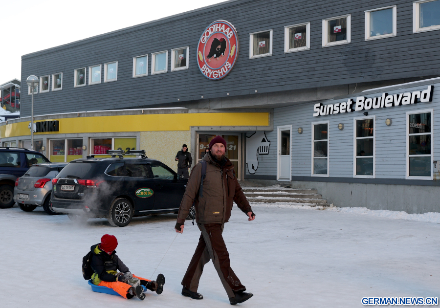 NUUK, 9. Februar 2026 (Xinhua) -- Das Foto zeigt einen Mann, der einen Schlitten mit einem Kind zieht, im Vorbeigehen an einem Supermarkt in Nuuk in Grönland, einem autonomen Gebiet Dänemarks, 8. Februar 2026. (Xinhua/Li Ying)