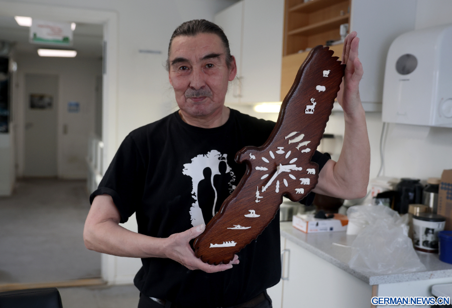 NUUK, 9. Februar 2026 (Xinhua) -- Der Künstler Louis Isbosethsen zeigt Kunsthandwerk aus Geweih in einer Werkstatt in Nuuk in Grönland, einem autonomen Gebiet Dänemarks, 7. Februar 2026. (Xinhua/Li Ying)