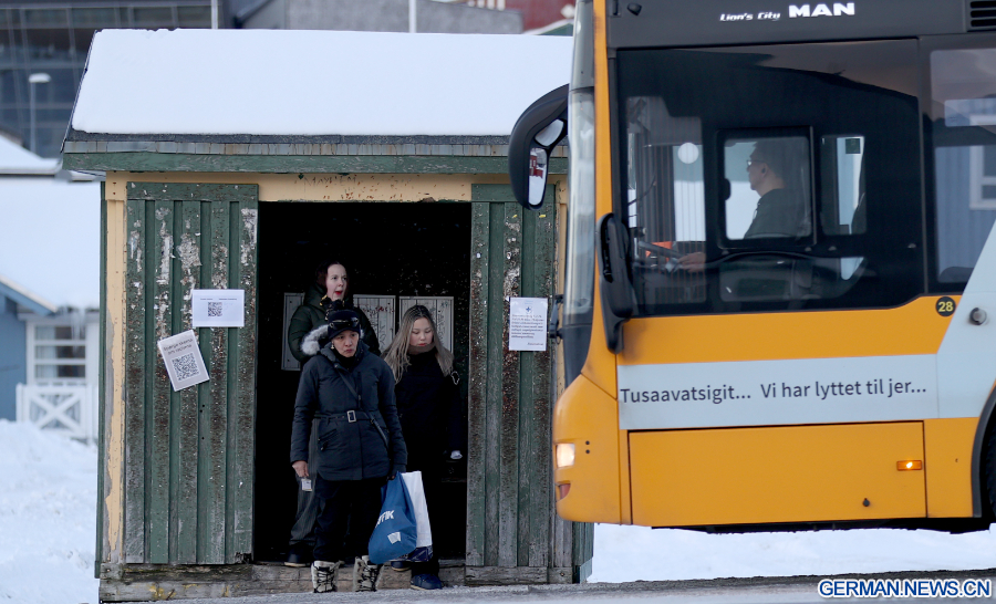 NUUK, 9. Februar 2026 (Xinhua) -- Menschen warten an einer Bushaltestelle in Nuuk in Grönland, einem autonomen Gebiet Dänemarks, 8. Februar 2026. (Xinhua/Li Ying)
