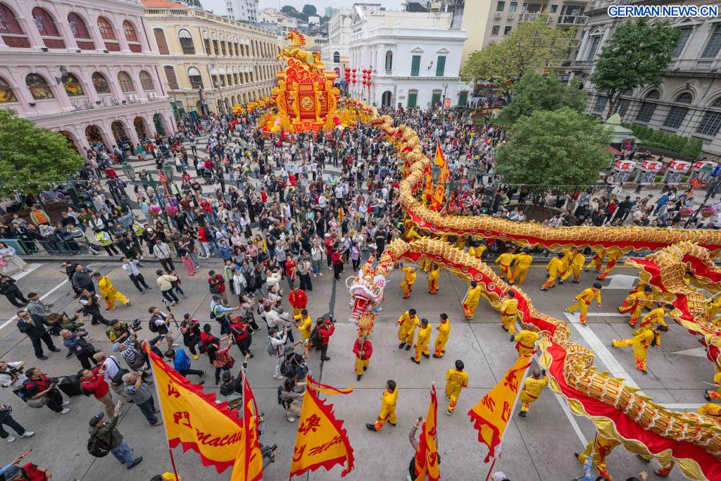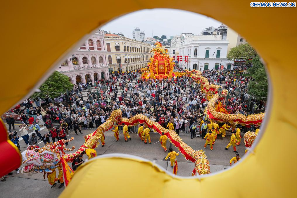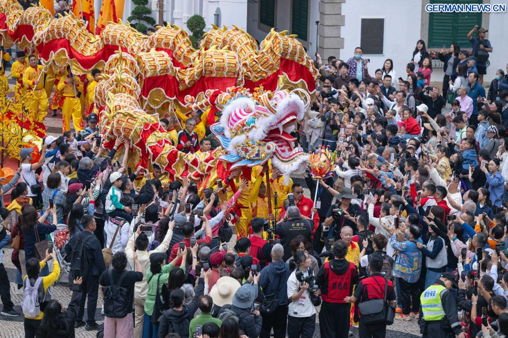 MACAO, 17. Februar 2026 (Xinhuanet) -- Künstler führen in Macao in Südchina einen Drachentanz zur Feier des Frühlingsfestes auf, 17. Februar 2026. (Quelle: Xinhua/Cheong Kam Ka)