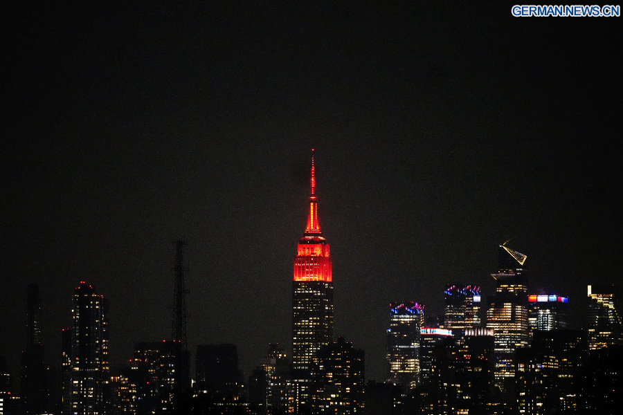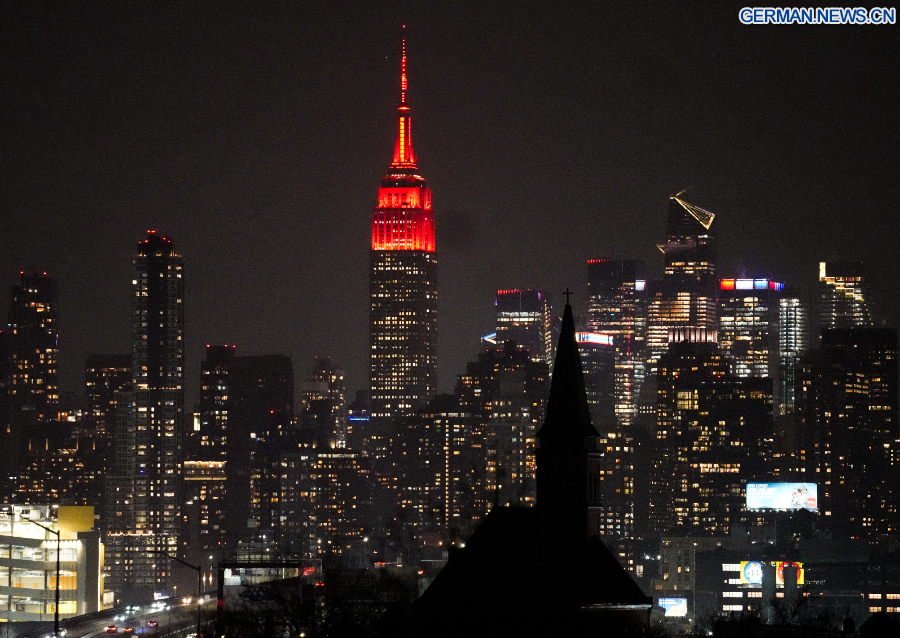 NEW YORK, 17. Februar 2026 (Xinhua) -- Zur Feier des chinesischen Neujahrsfests erstrahlt das Empire State Building in New York City in den USA in rotem Licht, 16. Februar 2026. (Xinhua/Zhang Fengguo)