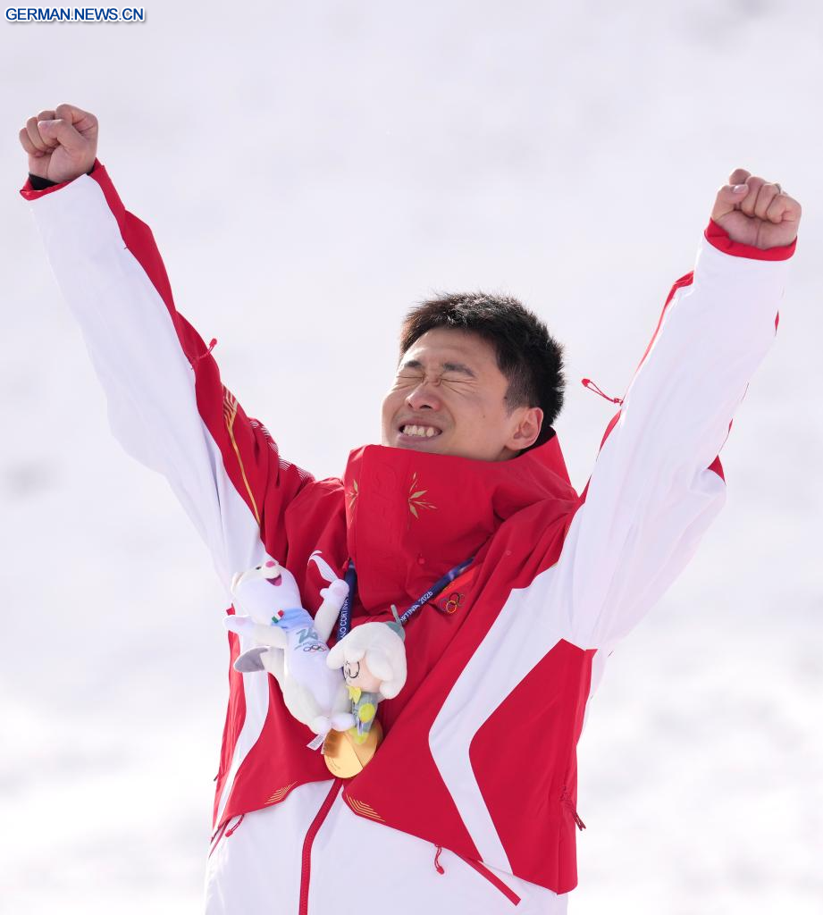 LIVIGNO, 20. Februar 2026 (Xinhuanet) -- Der Goldmedaillengewinner Wang Xindi aus China feiert während der Siegerehrung für Aerials-Wettbewerb im Freestyle-Skiing der Männer bei den Olympischen Winterspielen 2026 in Mailand-Cortina in Livigno, Italien, 20. Februar 2026. (Quelle: Xinhua/Wu Huiwo)