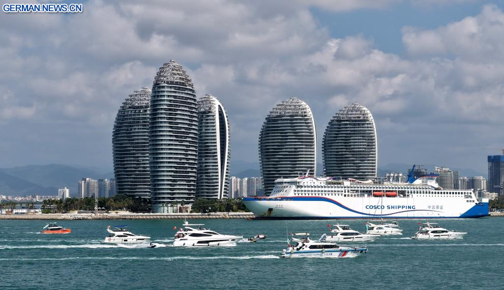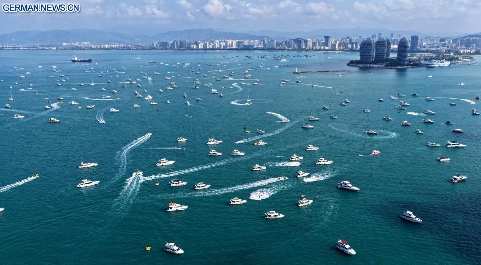 SANYA, 21. Februar 2026 (Xinhuanet) -- Das am 21. Februar 2026 aufgenommene Drohnenfoto zeigt Touristen, die mit Yachten fahren, in Sanya in der südchinesischen Provinz Hainan. Während der ersten Frühlingsfestferien seit der Einführung der speziellen Zollmaßnahmen auf der gesamten Insel im chinesischen Freihandelshafen Hainan hat sich die südliche Tropeninsel zu einem beliebten Ziel für Yachtausflüge entwickelt. Daten zufolge wurden in den ersten sechs Tagen der Frühlingsfestferien über 7.000 Yachtfahrten in Sanya unternommen. (Quelle: Xinhua/Zhao Yingquan)