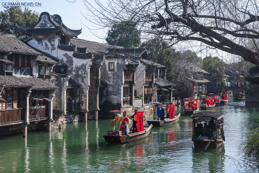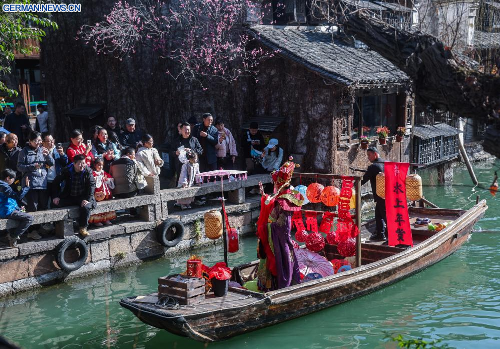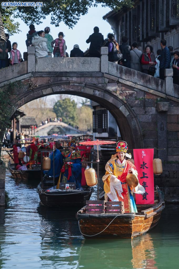 TONGXIANG, 21. Februar 2026 (Xinhuanet) -- Darsteller nehmen an einer Parade auf dem Wasser in Wuzhen in der Stadt Tongxiang in der ostchinesischen Provinz Zhejiang teil, 21. Februar 2026. Während der Ferien zum Frühlingsfest veranstaltete die antike Wassergemeinde Wuzhen über sechzig Aktivitäten, die die reiche Geschichte und die moderne Lebendigkeit der Gemeinde präsentieren, die sich in Volksbräuchen, Theater, Wissenschaft und Technologie sowie Kultur widerspiegeln. (Quelle: Xinhua/Xu Yu)