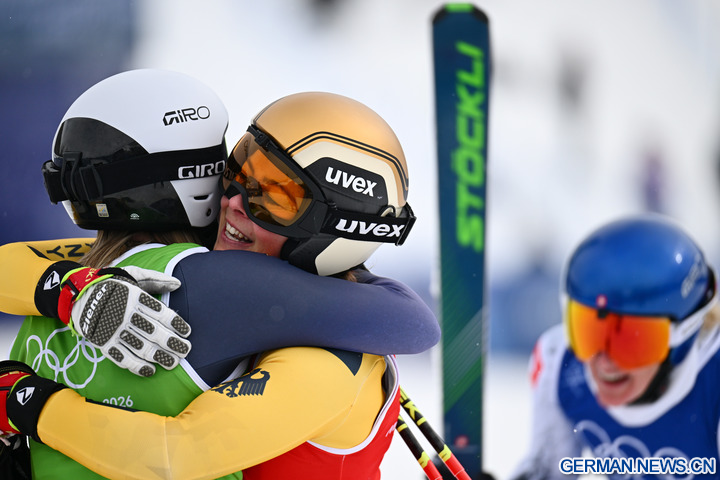 LIVIGNO, 21. Februar 2026 (Xinhua) -- Daniela Maier (Mitte) aus Deutschland umarmt Sandra Naeslund aus Schweden nach dem Finale im Skicross der Frauen im Freestyle-Ski bei den Olympischen Winterspielen Milano Cortina 2026 in Livigno in Italien, 20. Februar 2026. (Xinhua/Zhang Hongxiang)